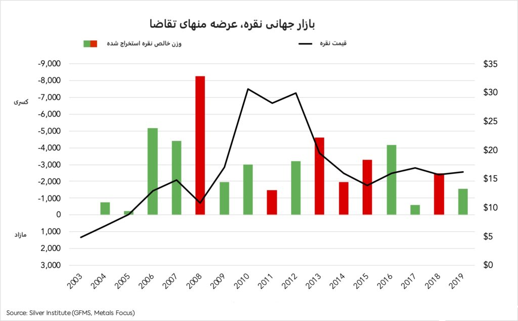 با اینحال، بسیاری از تحلیل گران معتقدند که معامله کردن روی نقره صرفا با تحلیل میزان عرضه توسط تولیدات معدنی، یک روش اشتباه برای تحلیل فلز خاکستری است چرا که، نقره نه فقط یک کامودیتی بلکه یک ارز است و در نتیجه، نمی توان همبستگی دقیقی بین میزان عرضه و قیمت آن به دست آورد. همچنان که در نمودار زیر در طی 18 سال، عرضه نقره همواره در کسری بوده اما قیمت نقره همیشه رو به رشد نبوده است.