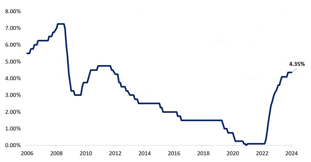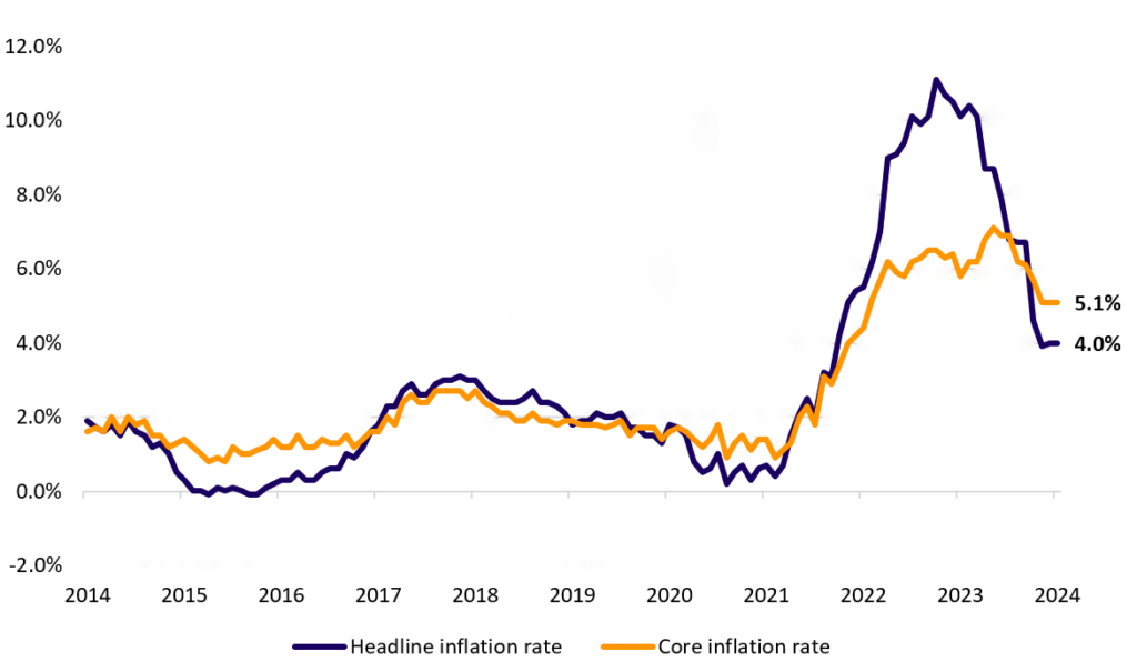 تا کنون، قیمتهای مصرفکننده بریتانیا در روند کاهشی بوده است، بهطوریکه تورم کل از اوج خود یعنی 11.1% در اکتبر 2022 به 4.0% در ژانویه 2024 تعدیل شده است. ژانویه امسال، از اوج 7.1 درصدی خود در می 2023، کاهش یافته است که نشان دهنده موفقیت در سیاست های محدودکننده فعلی در بازگرداندن تورم به هدف 2 درصدی است.