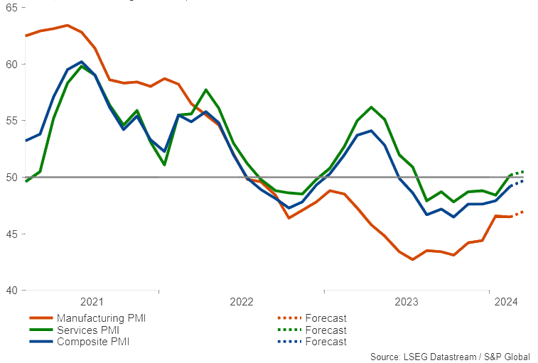 انتشار برآوردهای اولیه شاخصهای PMI ماه مارس حوزه یورو در روز پنجشنبه میتواند توجهات را به سوی یورو جلب کند. زیرا نتایج این دادهها میتواند بر انتظارات مبنی بر کاهش نرخ بهره توسط بانک مرکزی اروپا تأثیر بگذارد. در ماه فوریه PMI بخش خدمات برای اولین بار پس از ماه جولای از سطح آستانهی 50 عبور کرد اما بخش تولید همچنان در محدودهی انقباض باقی ماند.