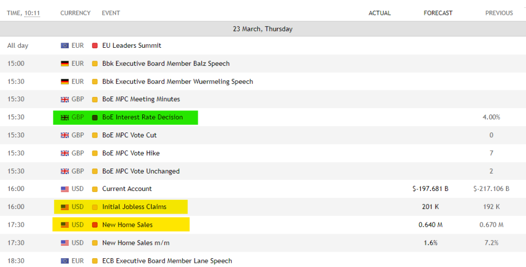 • با توجه به افزایش مجدد تورم بریتانیا در ماه فوریه، انتظار می رود که BoE در نشست امروز یک افزایش 25 واحدی دیگر را تجربه کند و نرخ بهره را به 4.25% برساند.